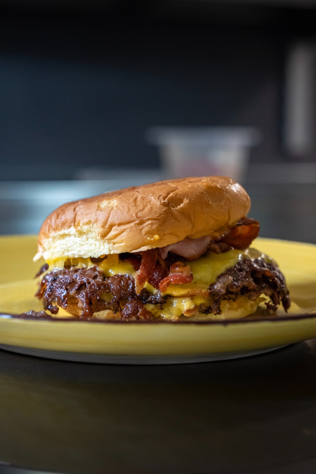 Pane bun, hamburger di scottona, bacon croccante, formaggio latteria, lattuga, pomodoro