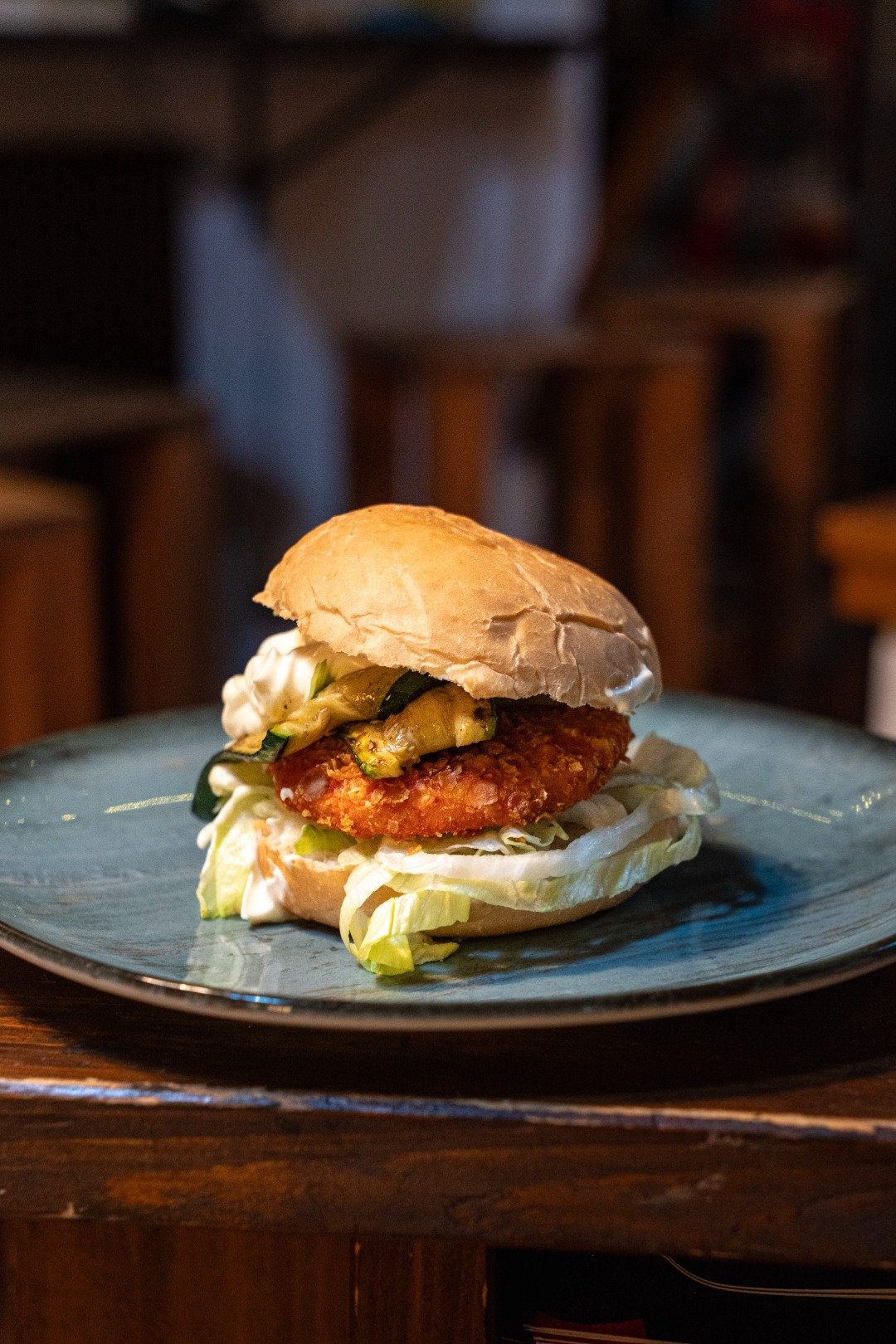 Pane Bun alle patate, speziata (e piccantina) cotoletta vegana*, zucchine grigliate, maionese vegana, insalata iceberg