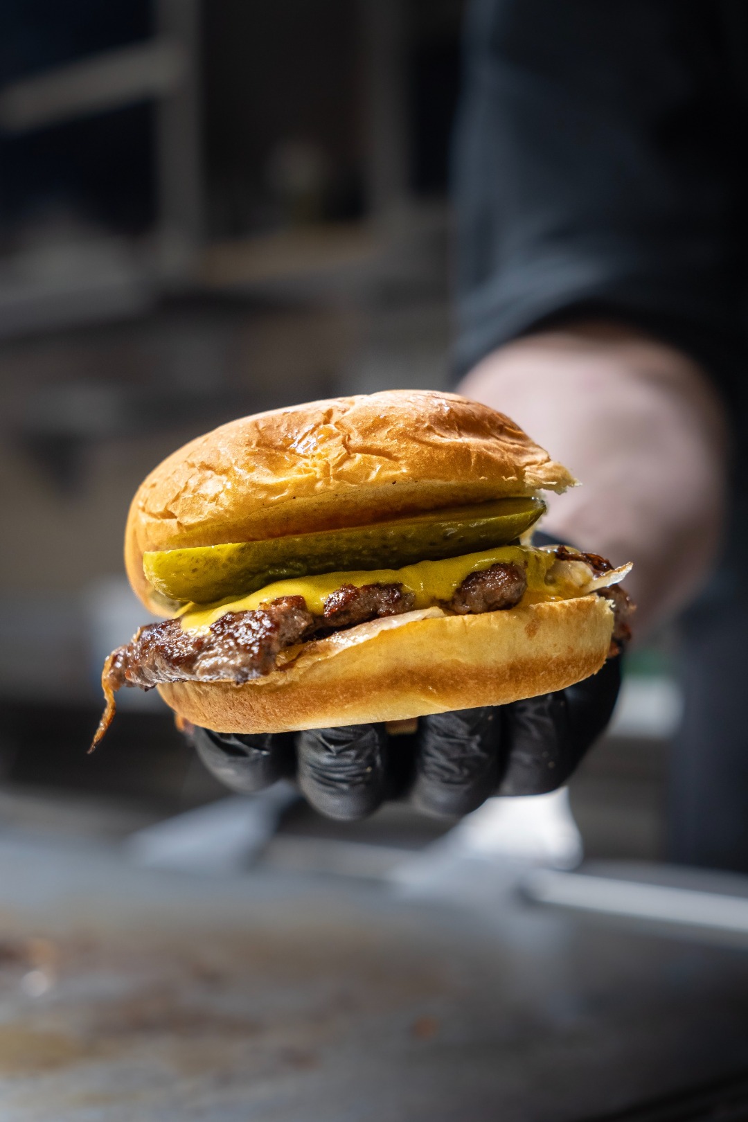 Pane Martin’s Potato Roll*, carne di manzo*, formaggio cheddar, cipolla viola, cetriolini, salsa burger.